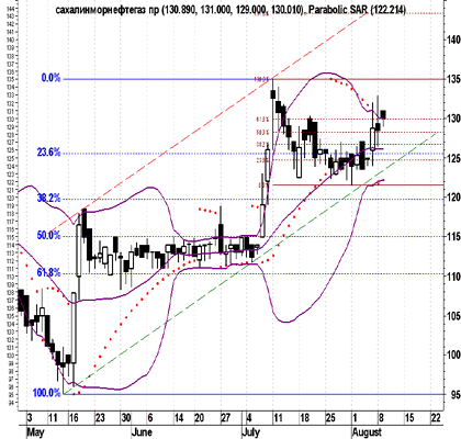 Уровень Фибоначчи ждет самых шустрых "быков" на отметке 143,25 рубля. Если учесть, что курс акций "Пурнефтегаз" привилегированные вчера выросли на 9,5%, то данный рубеж не является уж таким фантастичным.