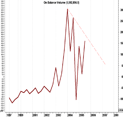 Денежный поток находится в области "перекупленности" и указывает на приток денег. Сигнал на продажу завершает свою фазу, но в то же время готов к новому росту с ростом курса акций (так как не пересекся с сигналом на покупку).