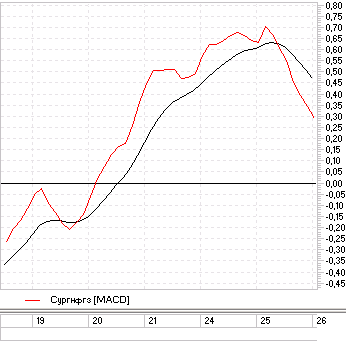 Кривая MACD пересекла сигнальную сверху вниз, находится в зоне перекупленности. На гистограмме тенденция к увеличению спрэда между кривыми. Сигналы на продажу.